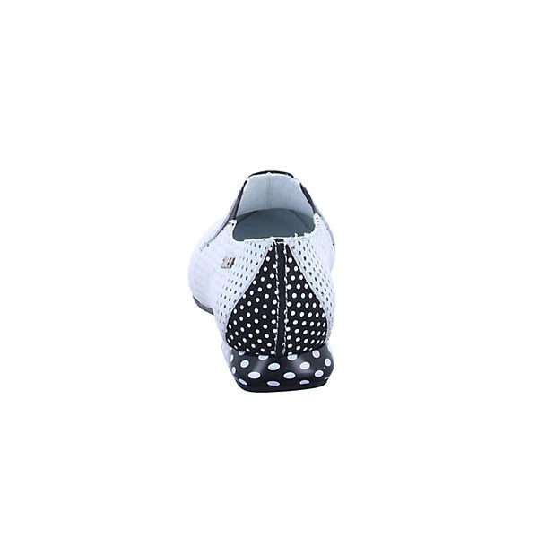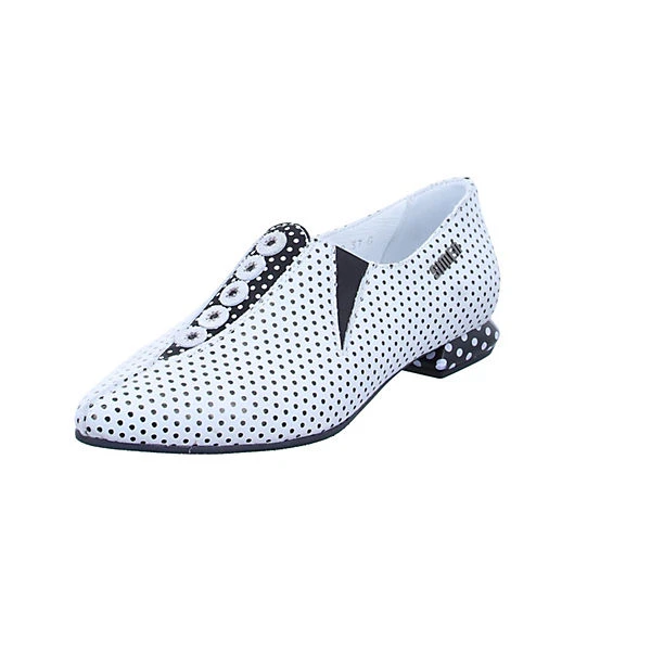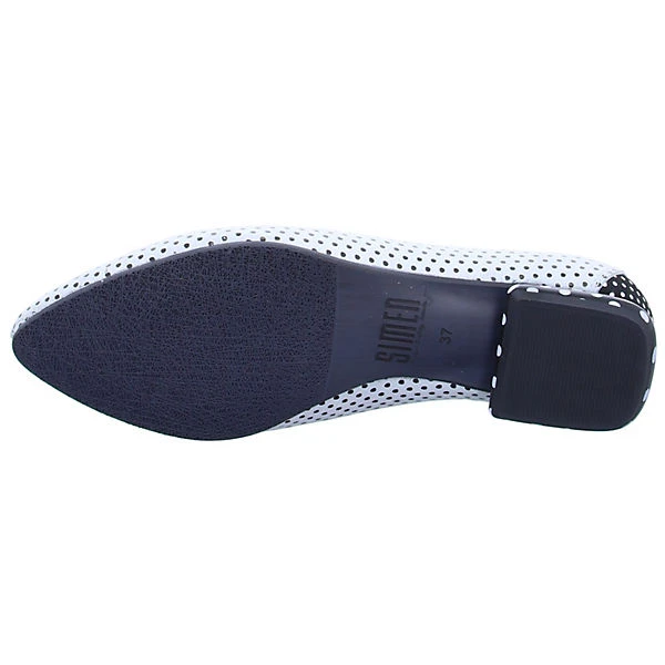 Absolut einzigartig zeigen sich die gepunkteten Damen Slipper aus dem Hause Simen in Weiß-Schwarz mit Ziernähten, Elastikeinsätzen, und dekorativen Knopf-Applikationen. Die komfortable Lederfußbettung sorgt für ausgezeichneten Laufkomfort.