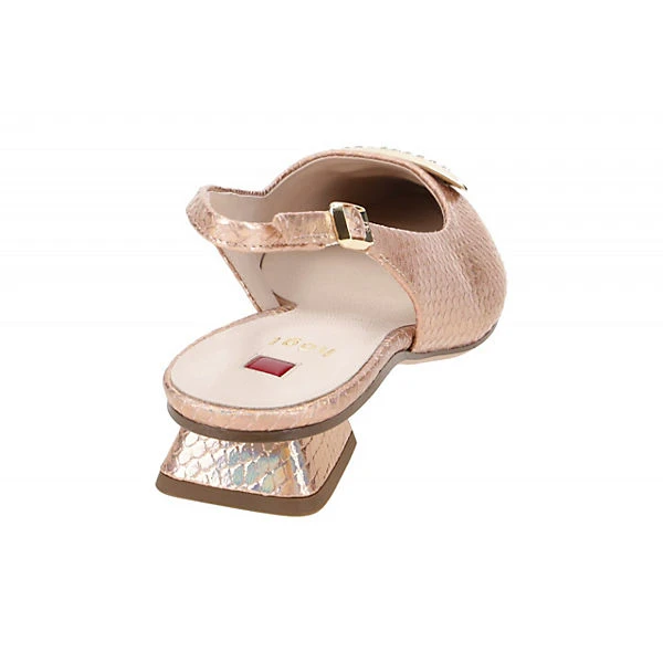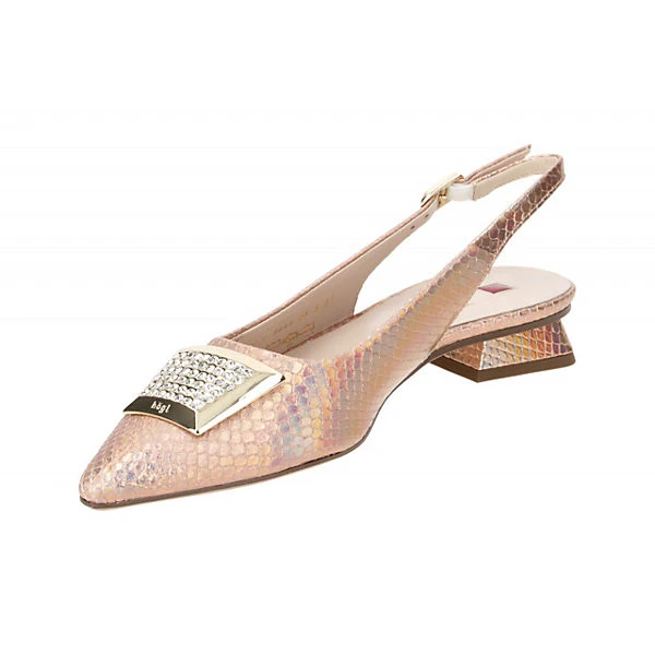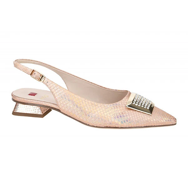 Hersteller: Högl Hersteller Art-Nr.: 5-10 2127 4800 Modellname: GRAZIA Machart: Damenschuhe – Sling Pumps, Slingback Farbe: rose metallic + bunter Regenbogen-Effekt + Schmuck goldfarben (lightrose) Obermaterial: Echtleder – Glattleder (Iridsnake-Leder – weiches Lammleder) Innenfutter: Echtleder – dünnes Leder Kaltfutter Innensohle: Echtleder – Fußbett Wechselfußbett: nicht herausnehmbare Innensohle Laufsohle: Gummisohle Verschluss: Schnalle Absatzart: Blockabsatz, Leder bezogen Absatzhöhe: kleiner Absatz, ca. 2cm Schuhform: spitz Größenhinweis: fällt normal aus Weitenangabe: F – normal Weite