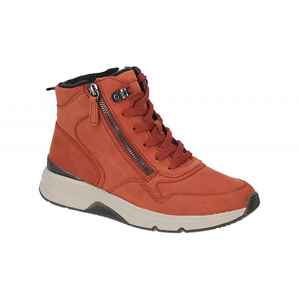 Hersteller: Gabor Hersteller Art-Nr.: 96.888.29 Modellname: ROLLINGSOFT Machart: Damen Stiefeletten – bequeme Stiefelette, Komfort Mid-Sneaker Farbe: rot + grau + schwarz (fox) Obermaterial: Echtleder – Nubuck (Nubuk Wax) Innenfutter: Textil – weich gepolstert, Flausch Innensohle: Textil Fußbett Wechselfußbett: Ja – herausnehmbare Innensohle Laufsohle: Gummi + Polyurethan (PU) – extra leicht Verschluss: Schnürung und Reißverschluss Absatzart: Keilabsatz / Wedge, Keil ca. 2cm Schafthöhe: Knöchelhoch, ca. 11cm Schuhform: rund Größenhinweis: fällt normal aus Weitenangabe: G – normal Weite