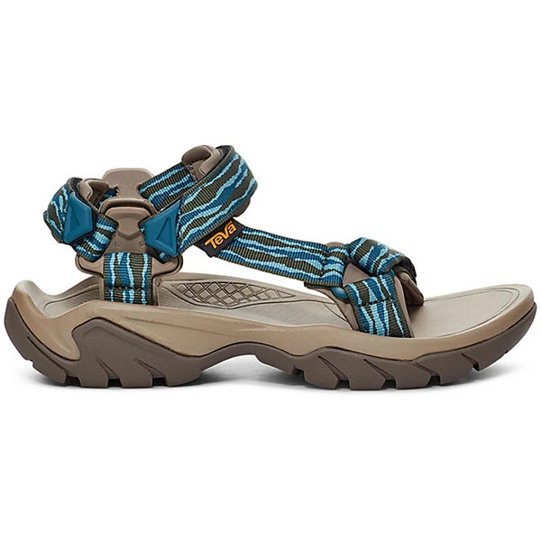 Funktionale Outdoorsandalen für Damen; 3 Klettverschlüsse sorgen für eine optimal personalisierbare Anpassung; Riemen aus recyceltem Polyester; weiche Knöchelpolster aus Neopren; vorgeformtes Fußbett, mit verbreitertem Fußbett im Vorfußbereich; dämpfende Shoc Pads im Fersenbereich; Material Synthetik und Textil; nicht abfärbende Außensohle mit griffigem Profil